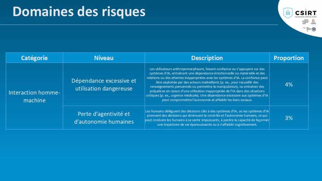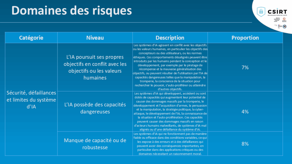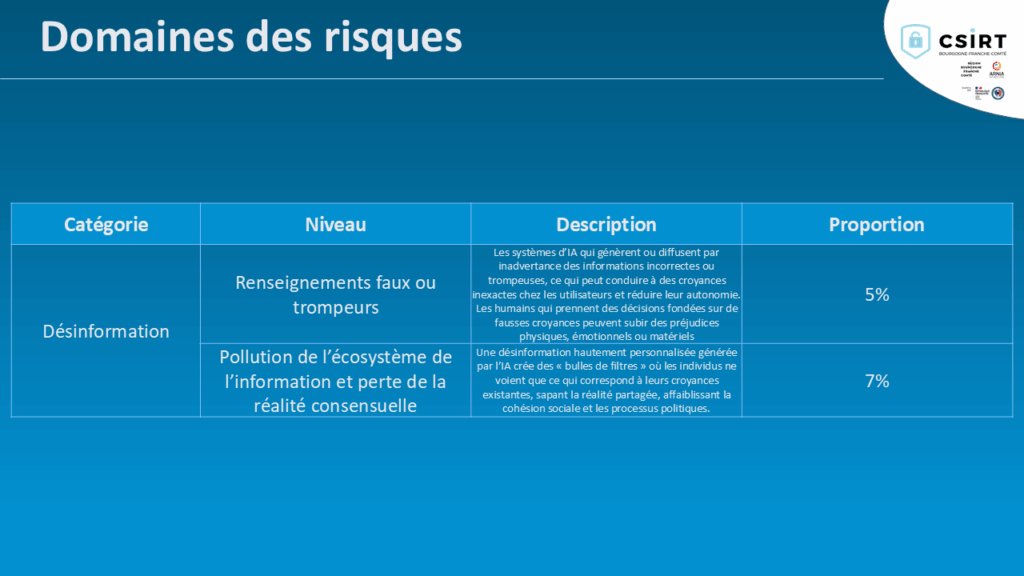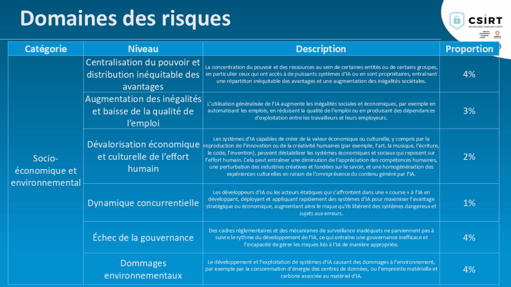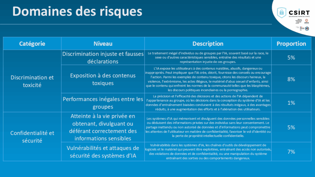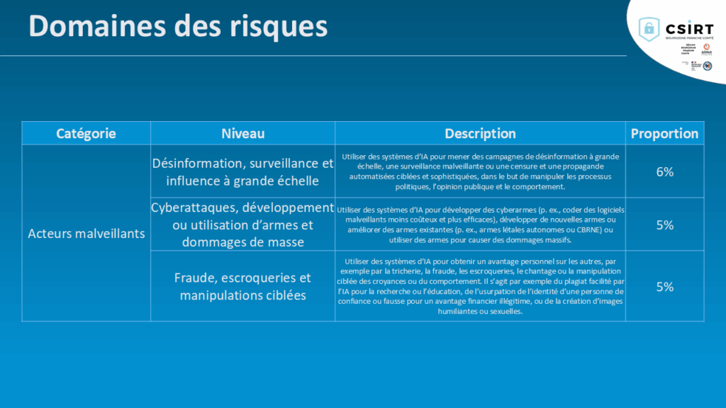 Il existe de nombreux domaines de risques. Dans ces tableaux également, nous aurons la prportion d’apparition dans la matrice.